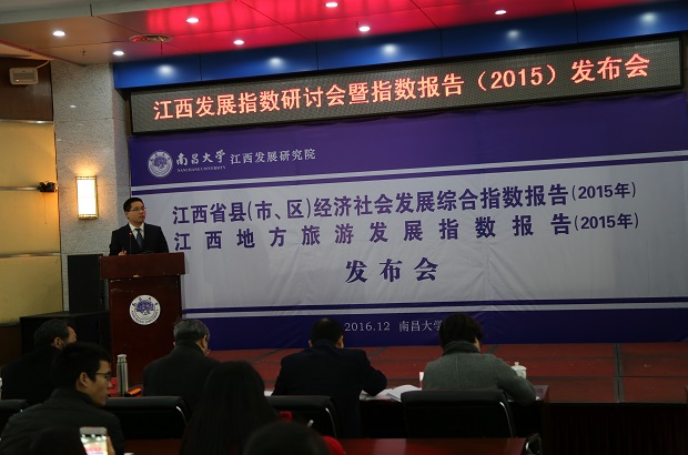 12?6日上午,南昌大学江西发展指数研讨会暨指数报告?015年)发布会在办公楼二楼多功能厅召开,会上发布了《江西发展综合指数报告》《江西地方旅游发展指数报告》为江西发展提供科学依据?br />