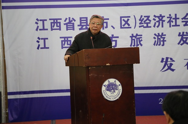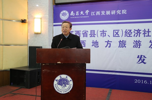 发布会上,南昌大学江西发展研究院院长黄细嘉致辞,省政府参事王志国,省政协委员彭道宾,省旅发委原副巡视员、中国未来研究会旅游分会会长曾宜富,江西师范大学旅游系主任冯淑华分别就江西发展综合指数和江西地方旅游发展指数研究作主旨报告并指数报告作专业点评。发布会由江西发展研究院副院长钟贞山主持?br />